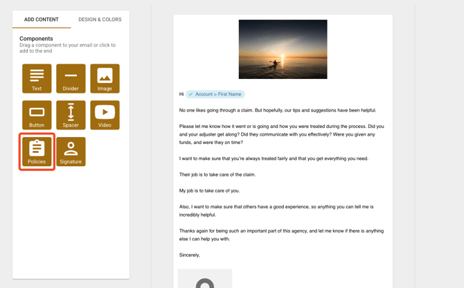 Drag the Policies component from the left side of the screen into your email within the builder. The component will load on the page!