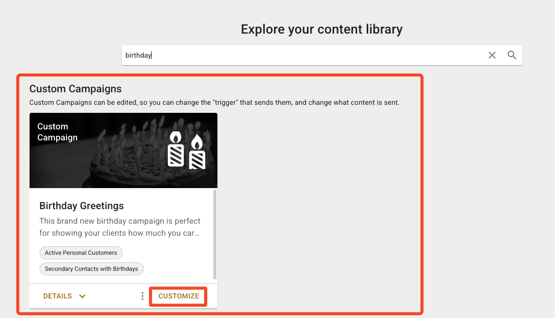 Search for the Custom Campaign named "Birthday Greetings" and click "Customize."