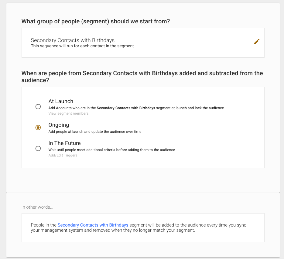 Now that you are in the Secondary Contacts Segment, you'll need to determine when you want people added to the audience. The default option here is "Ongoing," where all group members are added at launch and new members are added when they match your group.