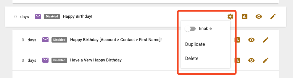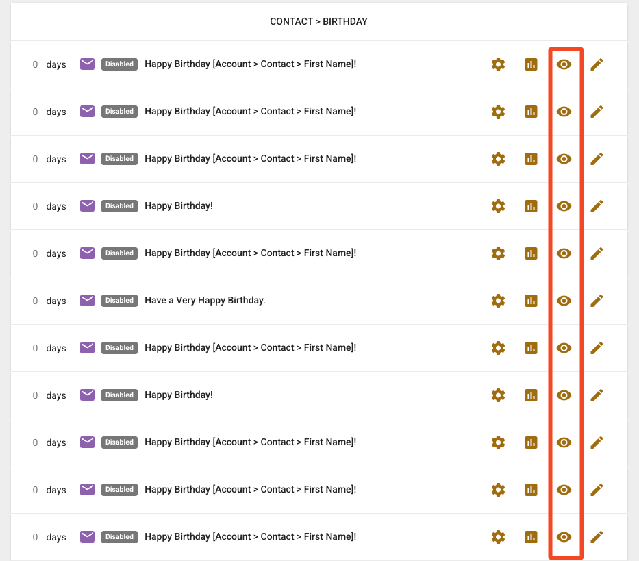 Next, scroll down to view the "Steps." You will have several different pre-written birthday emails to choose from. You can click on the eye icon to preview each message.
