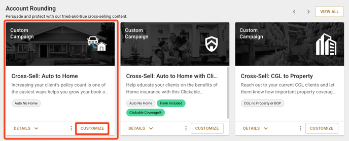 Scroll to the the "Account Rounding" section, locate the Cross-Sell Campaign: Auto to Home and select "Customize." This will add the cross-sell campaign to your Custom Campaign Library. Click "View/Edit" option on the right side of your screen to start customizing the campaign.