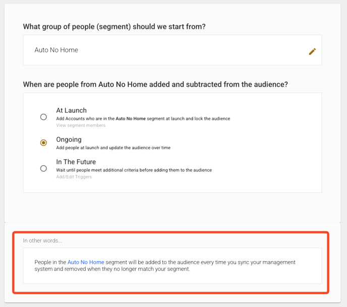 Next up, we will confirm when people will be added or removed from the audience. The campaign defaults to add audience members on an "Ongoing" basis. This means that if a customer buys a home policy, they will be removed from the campaign. Alternatively, if a customer no longer has a home policy and they just have an auto policy, they would be added to the campaign.