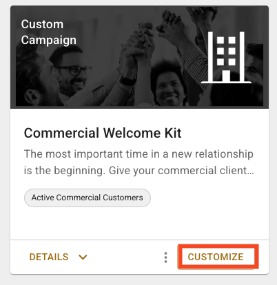 Let's focus on setting up the custom version of this campaign. After you locate the Custom Campaign - Commercial Welcome Kit in the Content Library, select "Customize" to add the campaign to your custom campaigns library.