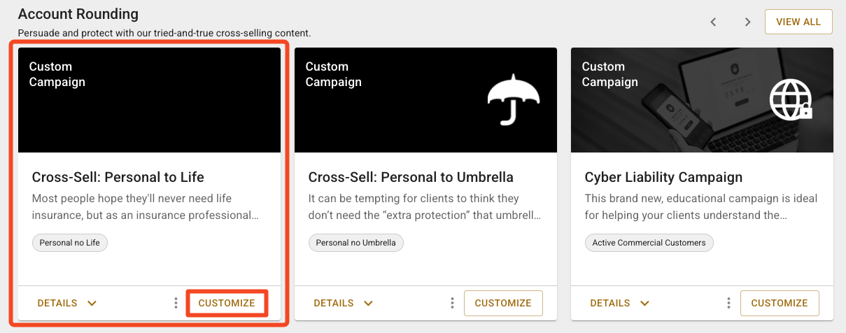 Scroll down to the "Account Rounding" section, locate the Cross-Sell: Personal to Life Campaign and select "Customize." This will add the campaign to your Custom Campaign Library. Click on the "View/Edit" option to the right side of your screen to start customizing the campaign.