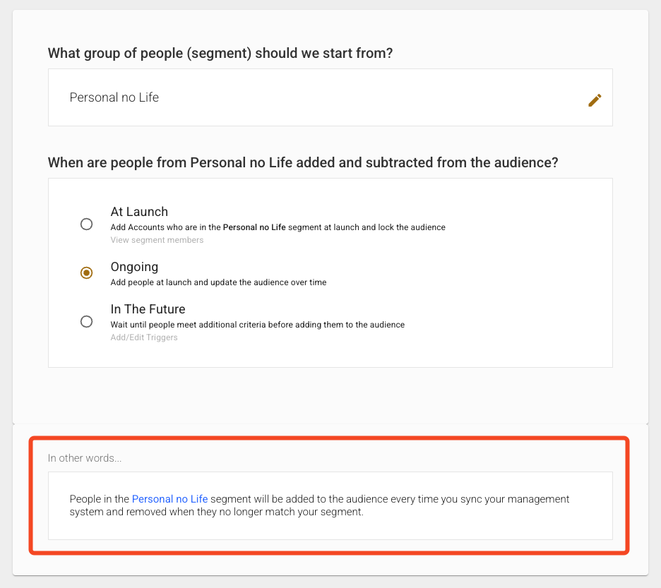 People in the Personal to Life segment will be added to the audience every time you sync your management system and removed when they no longer match your segment.