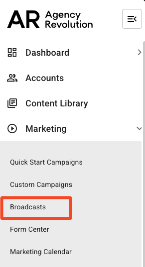Open up the lefthand sidebar and click on the "Marketing" option, then select "Broadcasts" from the nested list of options.
