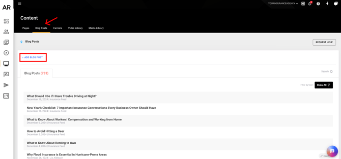 Once on the Content page of the dashboard, tab over to the "Blog Posts" tab, and select "Add Blog Post."