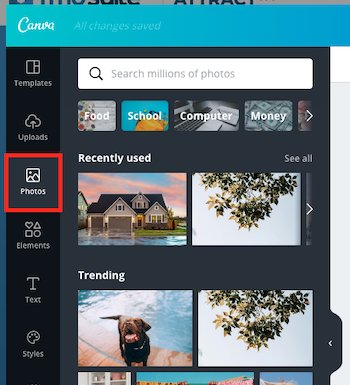 Canva has a great library of stock photos for your designs. Navigate to the "Photos" tab to browse their collection of photos: