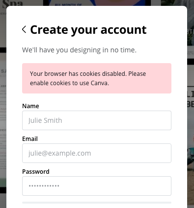 To create a Canva account, you must enable cookies in your browser.
