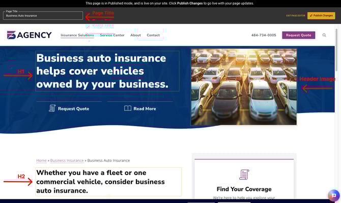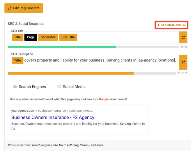 Forge websites allow for text editing on our coverage pages so you can capture your agency’s unique offerings. You can also edit the page title, SEO title, and SEO descriptions on every page of your site from within the Agency Revolution workspace.