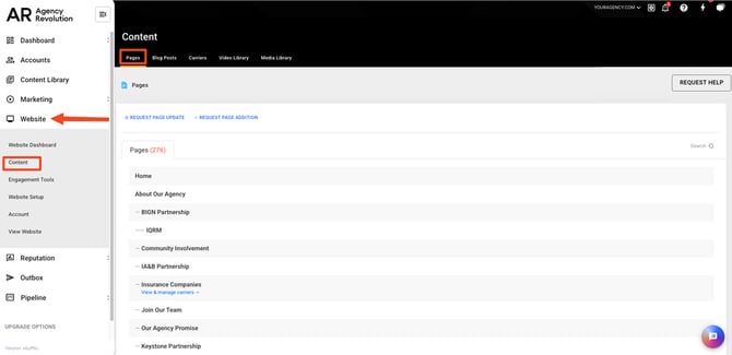 To access the Forge content editor, first log in to your Agency Revolution workspace and navigate to the Website option in the left-hand sidebar. From there, select “Content.” By default, you will be brought to the “Pages” menu option.