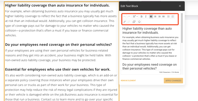 Clicking into any gold-highlighted section allows you to edit the content within that element. You’ll find standard text editing options like formatting, hyperlinks, and the ability to add images and icons within the editor.
