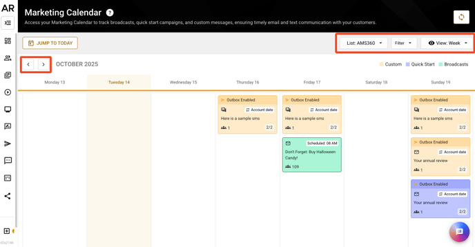 Week View allows you to see the scheduled and sent Fuse communications for a given week in a handy calendar view. You can scroll through weeks using the arrows next to the date at the top of the screen. You're also able to filter types of communications, your AMS list if applicable, and switch between views.