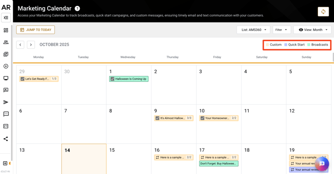 Fuse offers a Marketing Calendar with four views to allow you to easily visualize what communications have been sent and are scheduled to send out of the Fuse platform. You're able to view the texts and emails associated with Custom and Quick Start Campaigns, as well as one-time email Broadcast messages.