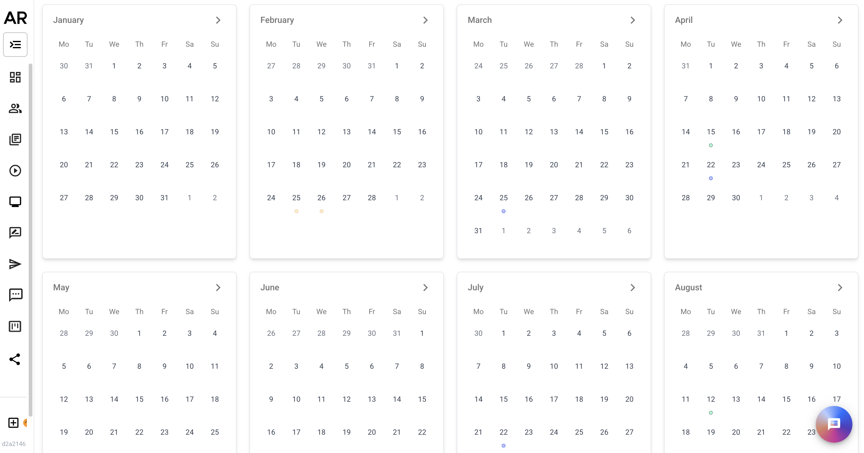 Each month for a given year is captured in this view and the little dots beneath each date represent one communication being sent from Fuse. You can click onto a date with dots beneath it to see a fuller view of what is being sent on that day.
