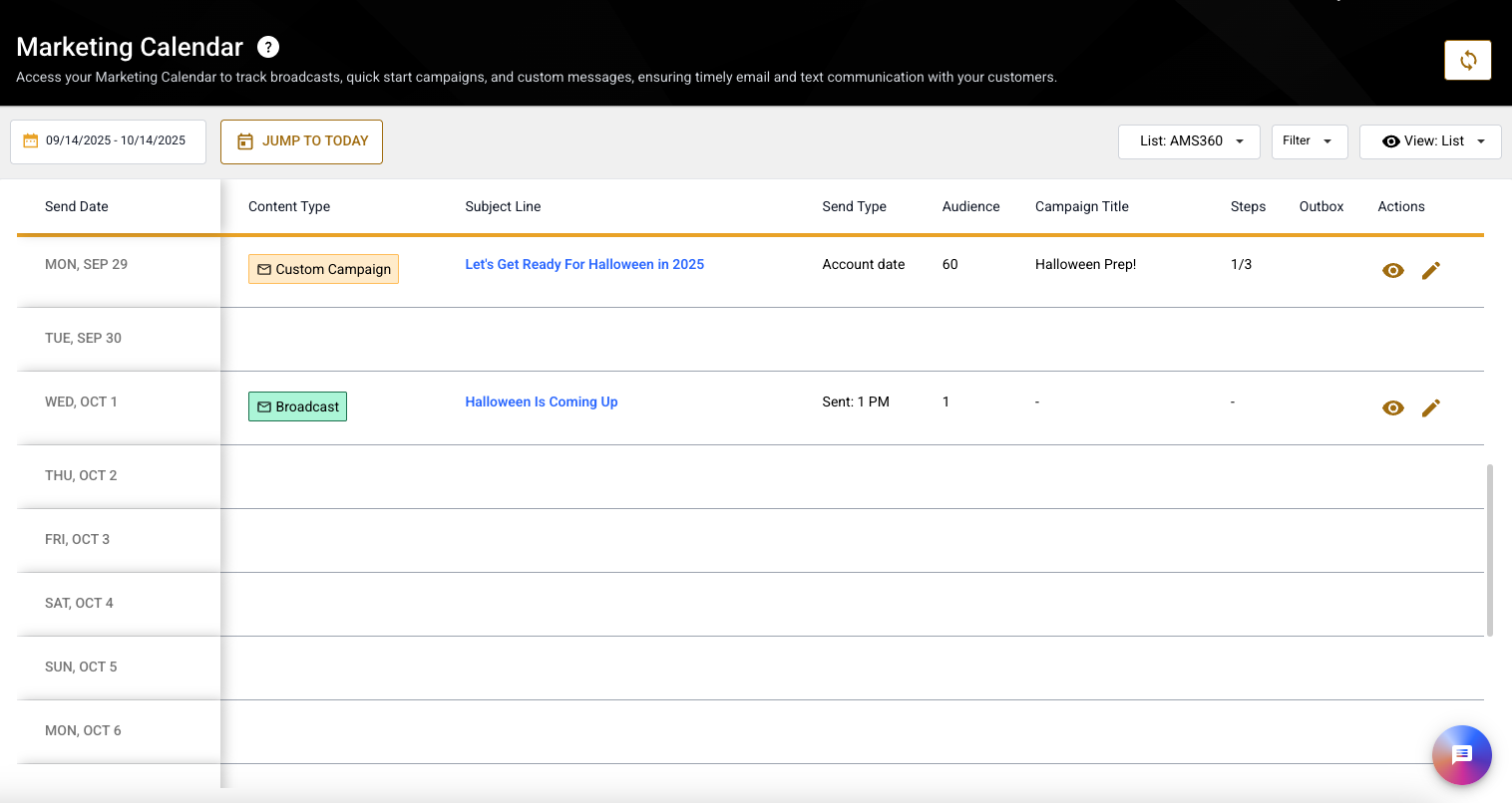 The “Actions” column has familiar eyeball and pencil icons. When clicking the eyeball, you’ll open the details modal for a specific communication. When clicking the pencil, you leave the Marketing Calendar and go to edit that specific message.