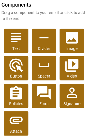 - Clicking a component adds it to the bottom of your email; you can also drag and drop components into position.