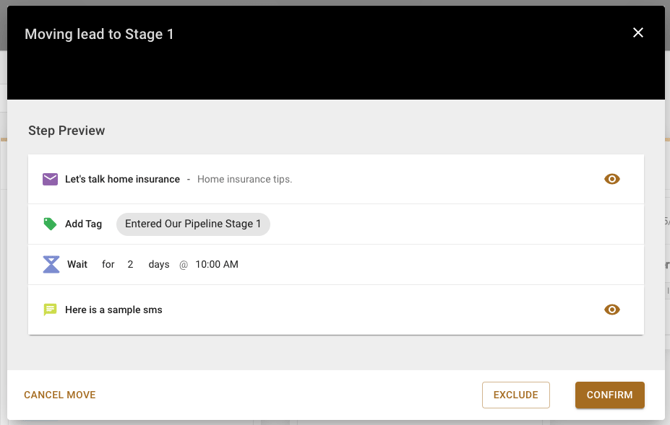When transitioning a lead to a new stage, a window will pop up to provide a preview of the upcoming steps in their new stage.