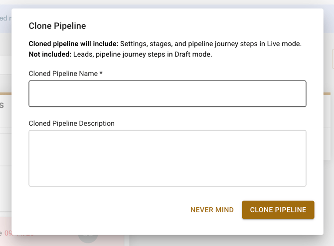 Please be aware that when cloning your Pipeline Journey, only live Journey steps will clone to your new Pipeline Journey. Not to worry! We have a handy tooltip that will pop up to remind you that any steps in Draft mode will not be cloned. As well, no leads can be cloned between Pipeline Journeys.