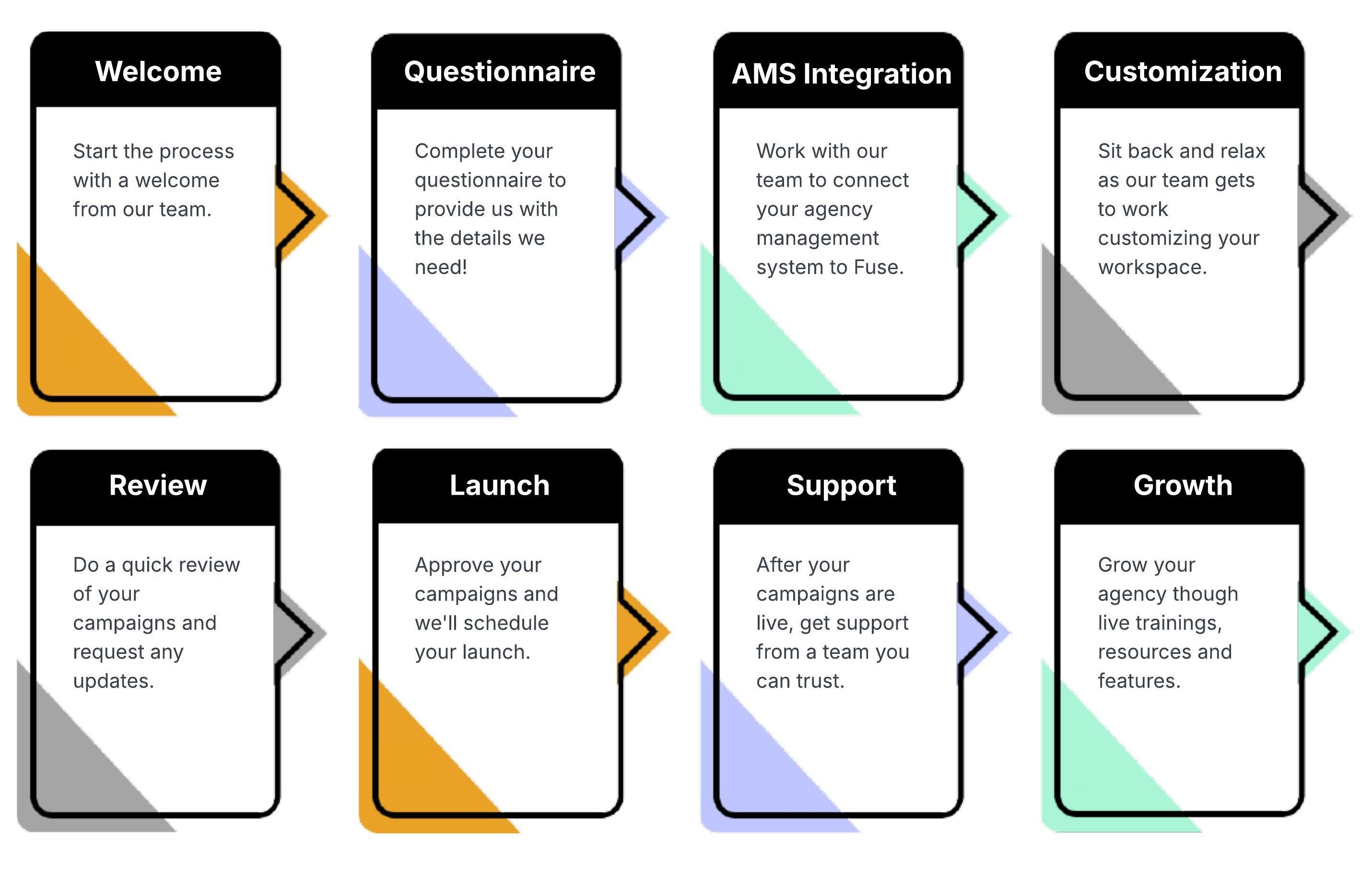 Welcome to Agency Revolution! Here, you’ll find a quick overview of the Fuse Onboarding process. From sign-up to launch and beyond, here are the steps our team will guide you through so you can start growing your agency.